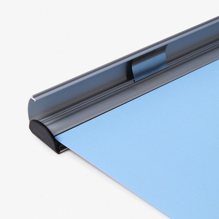Die Posterschiene EasyFix ist in verschiedenen Formaten erhältlich und wird mit zwei verschiebbaren Aufhängeösen geliefert.