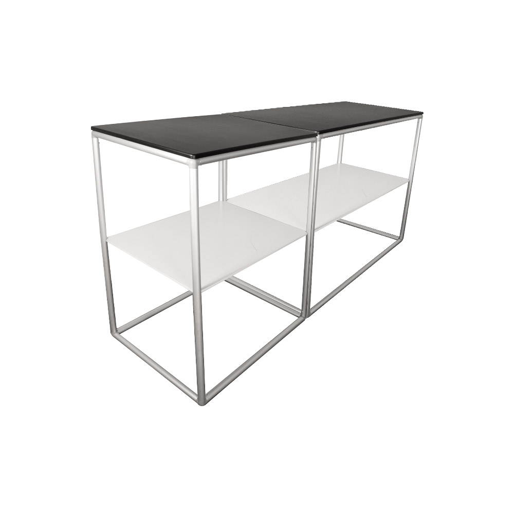 Die Messetheke Modulate ist vollständig werkzeuglos aufbaubar und lässt sich in wenigen Minuten aufstellen. Die bedruckte Spannstoffgrafik kann wahlweise auf oder unter der Thekenplatte angebracht werden, je nach Bedarf und Anwendung. Die Thekenplatte ist aus schwarzem, thermogeformtem MDF gefertigt und verleiht der Theke eine elegante Optik. Optional ist auch ein Regal aus weißem, laminiertem MDF erhältlich.